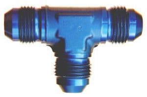 Speedflow -10 AN Tee has equal male ports. These are machined from aluminium with a blue anodised finish.