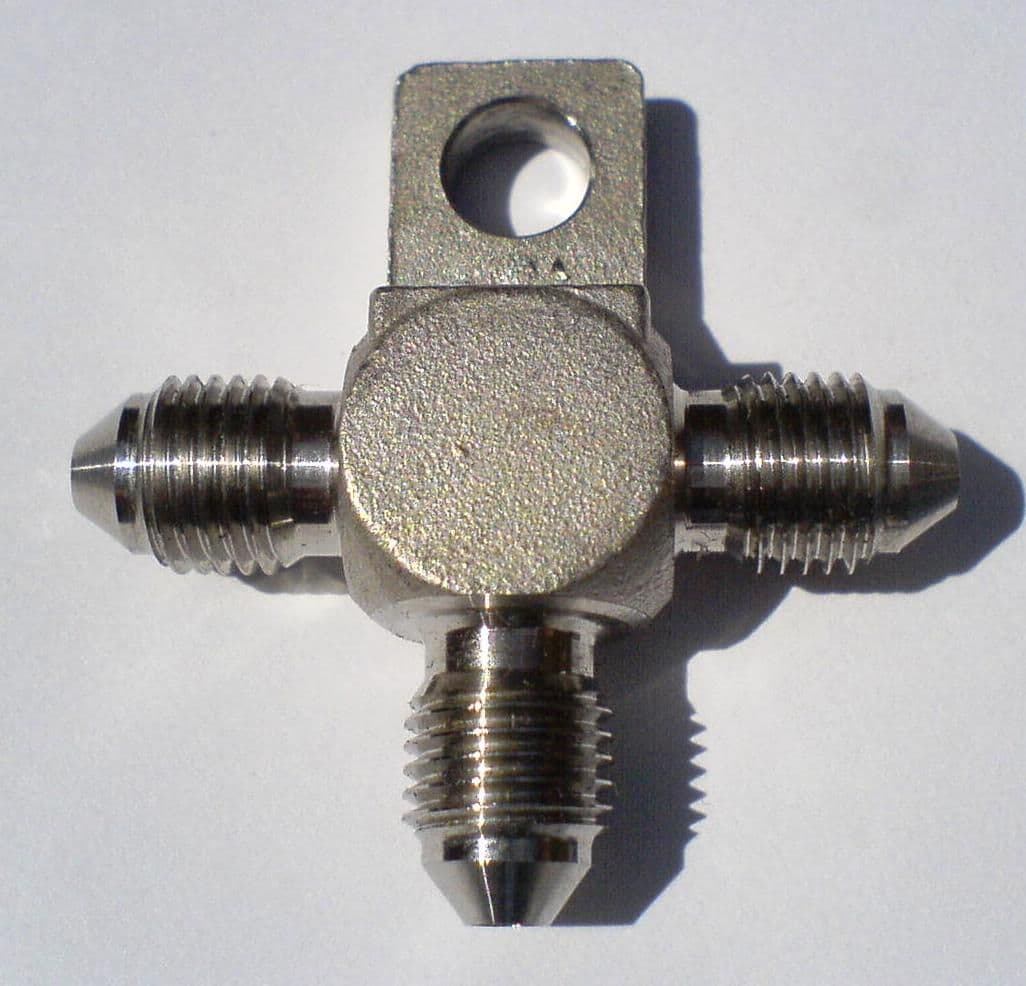 Speedflow -3 AN ENS equal T with a mounting bolt lug. Often used on braking systems to receive a flexible hose and distribute to the brakes on either side.